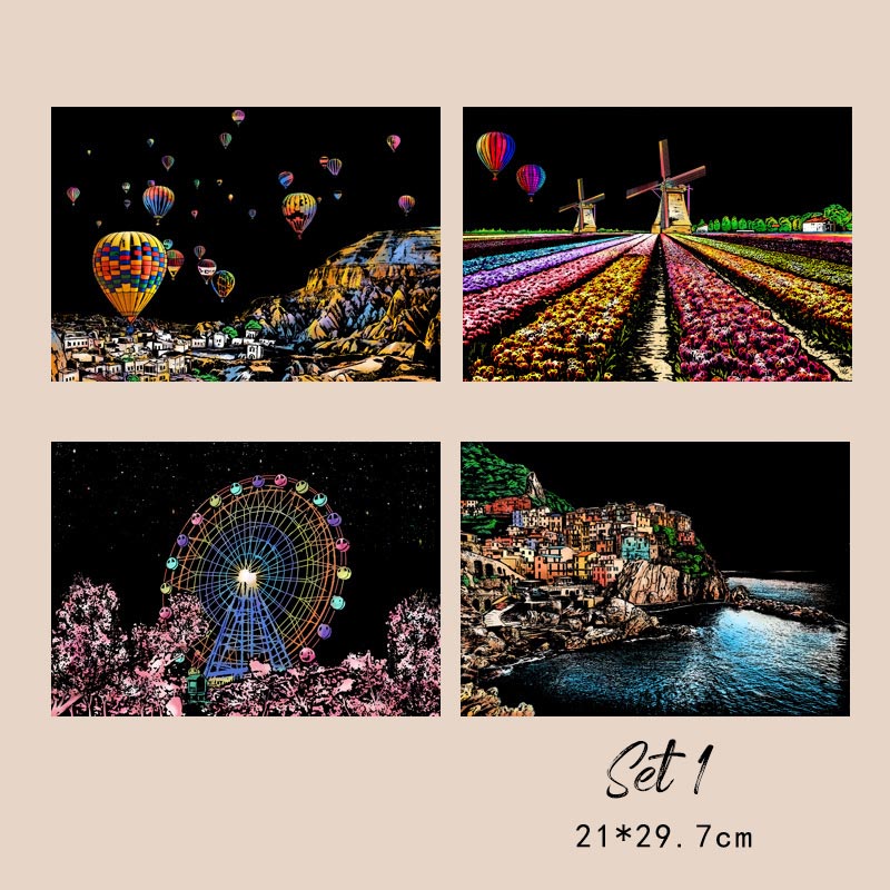 Cet ensemble comprend 4 scĂšnes magnifiquement conçues, offrant une activitĂ© artistique amusante et relaxante. LibĂ©rez votre Ăąme dâartiste en rĂ©vĂ©lant de superbes paysages urbains en grattant la couche sombre.