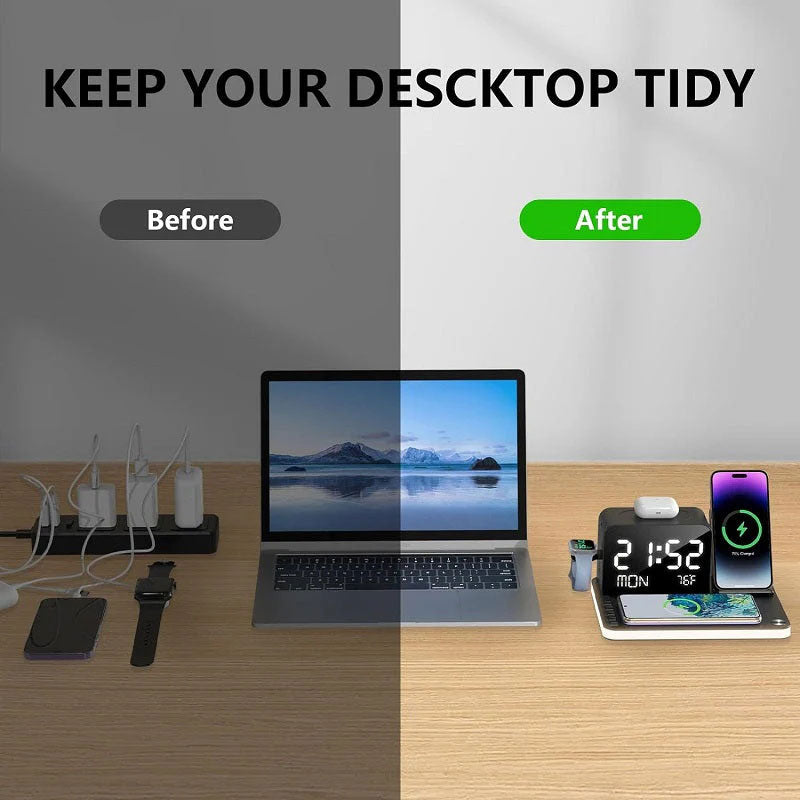 4-in-1-Schnellladestation mit Uhr und kabelloser Ladefunktion